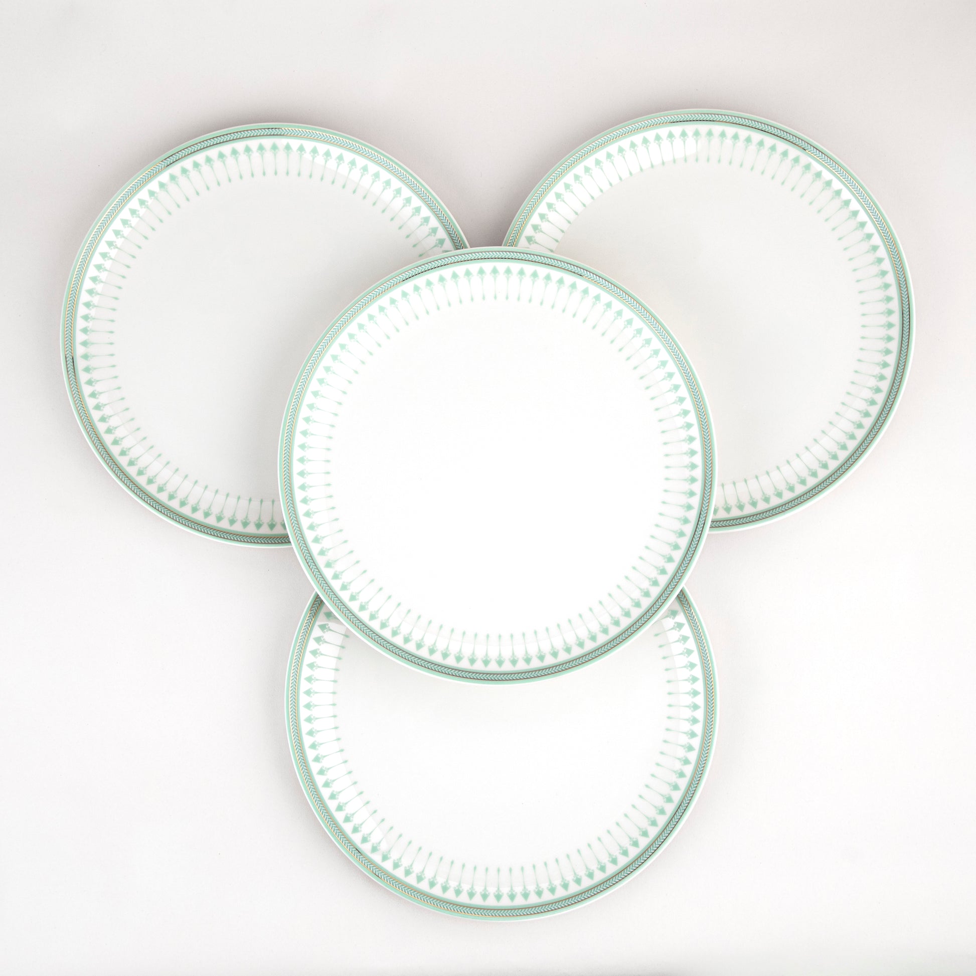 Timeless and refined, the Gulnaar Dinner Plates are designed to form the foundation of an elegant table setting. Crafted in fine porcelain, the plates feature a subtle radial border in soft aqua tones, inspired by the symmetry and detailing found in Kashmiri architecture and traditional motifs. Finished with a delicate 24-karat gold rim, the design balances minimalism with quiet luxury.