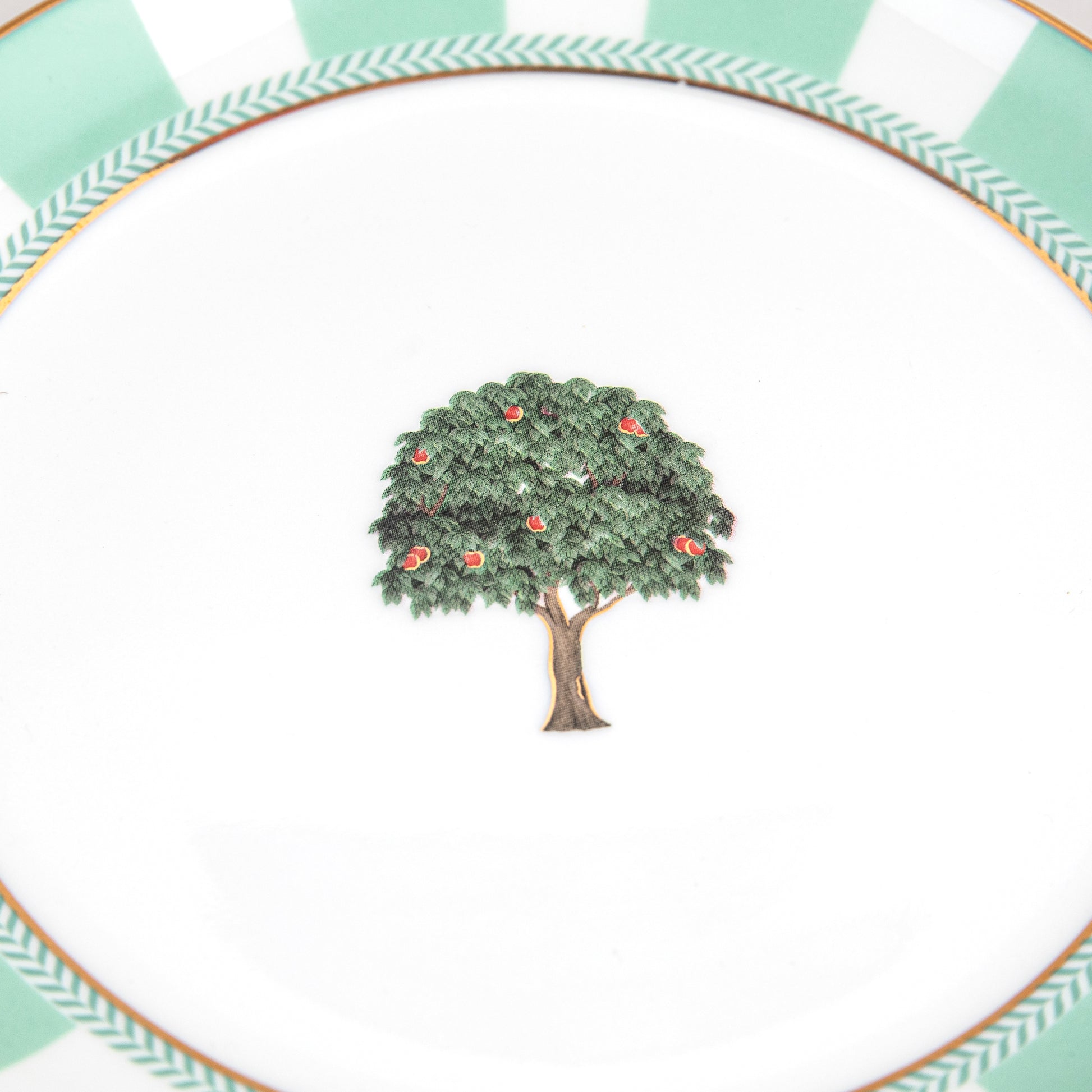 Charming and versatile, the Gulnaar Side Plates bring a sense of freshness and ease to the table. Crafted in fine porcelain, the plate features a hand-illustrated apple tree at the centre, framed by soft aqua stripes, delicate patterned detailing, and a refined 24-karat gold rim. Inspired by Kashmir’s orchard landscapes, the design feels both playful and timeless.