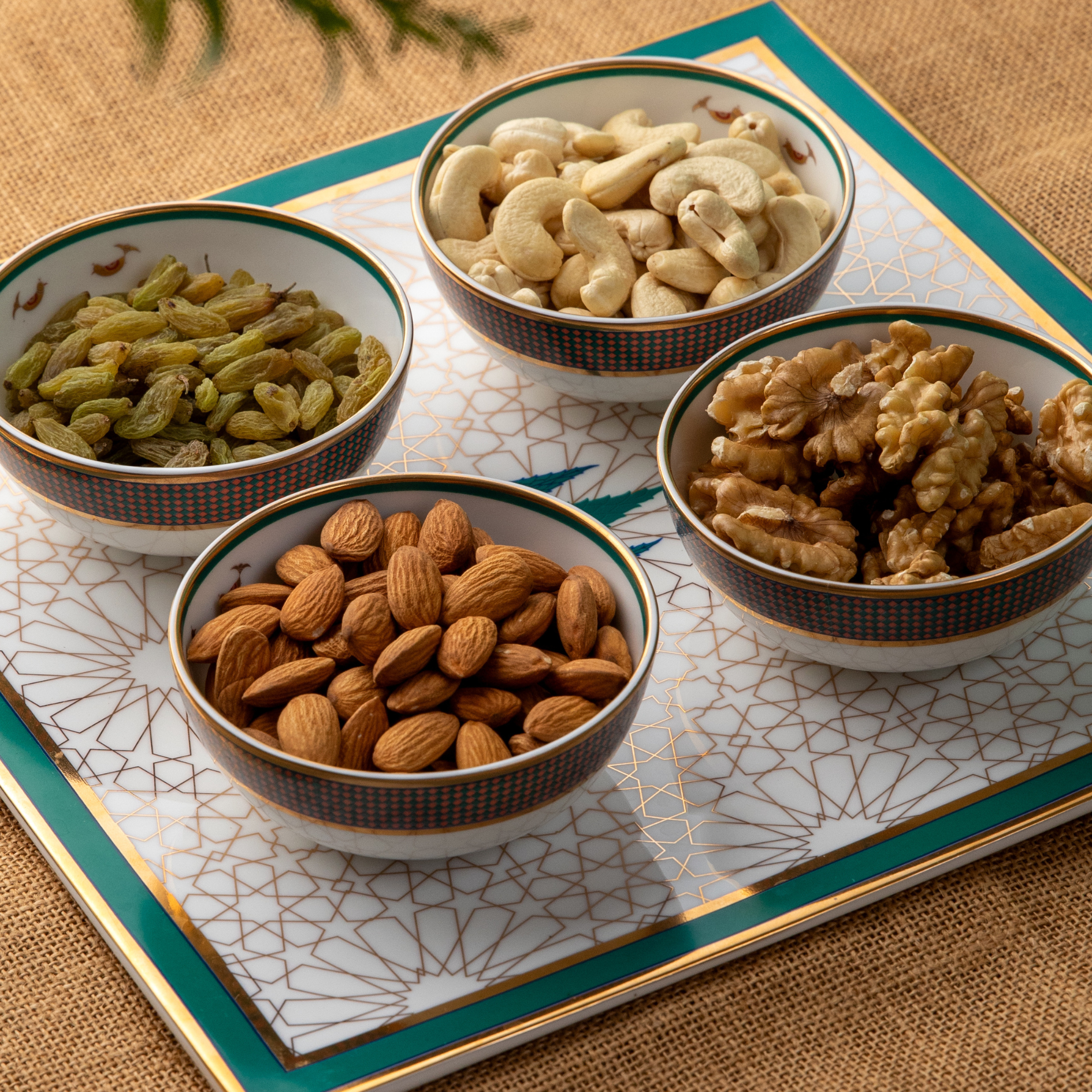 Delicate yet bold, this fine china katori from our Myrtle Series features a striking geometric border and subtle palm detailing inside, finished with 24-karat gold accents. Perfectly sized for chutneys, dips, or desserts, it brings charm and refinement to every serving.