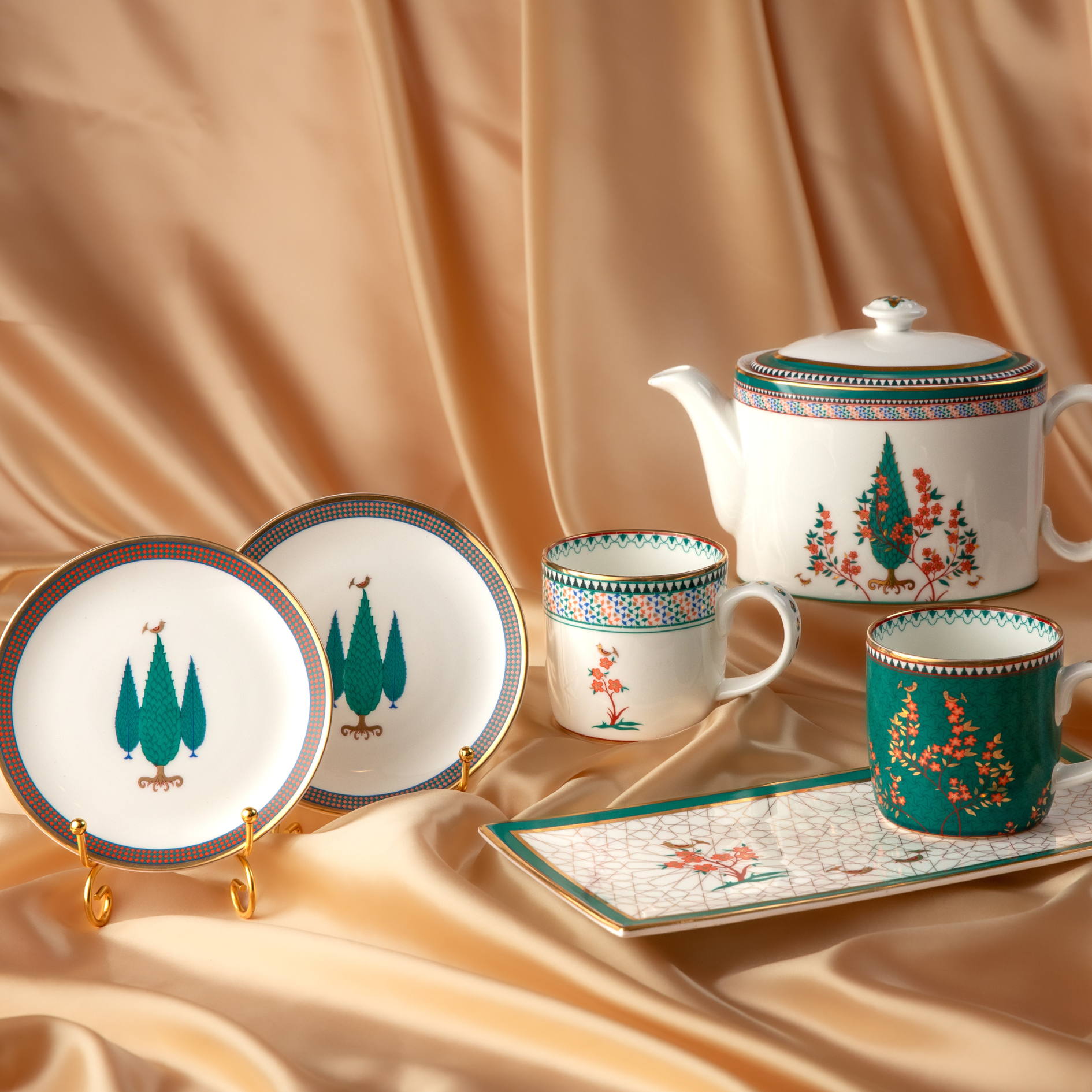 These round tapas plates from the Myrtle Series are crafted for serving appetizers with elegance and style. Inspired by the intricate beauty of the Alhambra Palace in Spain, the design showcases delicate Moorish patterns adorned with 24-karat liquid gold for a luxurious finish. At the center of each plate, motifs of pine trees symbolize tranquility and endurance, adding a touch of nature-inspired charm.