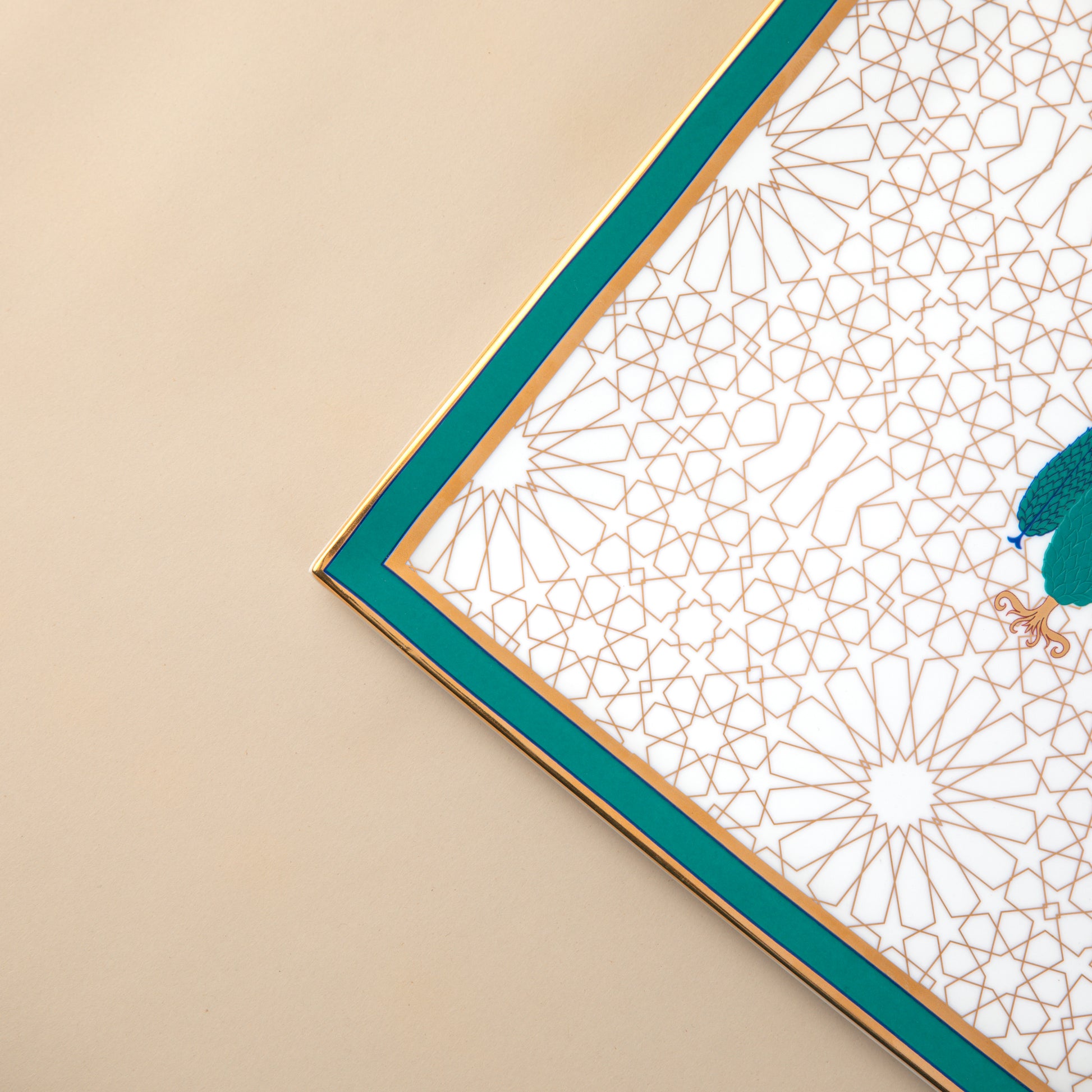 Part of the Myrtle Series, this square platter is adorned with the intricate Moorish patterns and enhanced with 24-karat gold, adding a touch of opulence to its sophisticated design.At the heart of the platter, motifs of pine trees symbolize resilience and tranquility, creating a harmonious centerpiece. The combination of the shimmering gold detailing and the smooth bone china finish makes this platter a stunning addition to any dining experience.